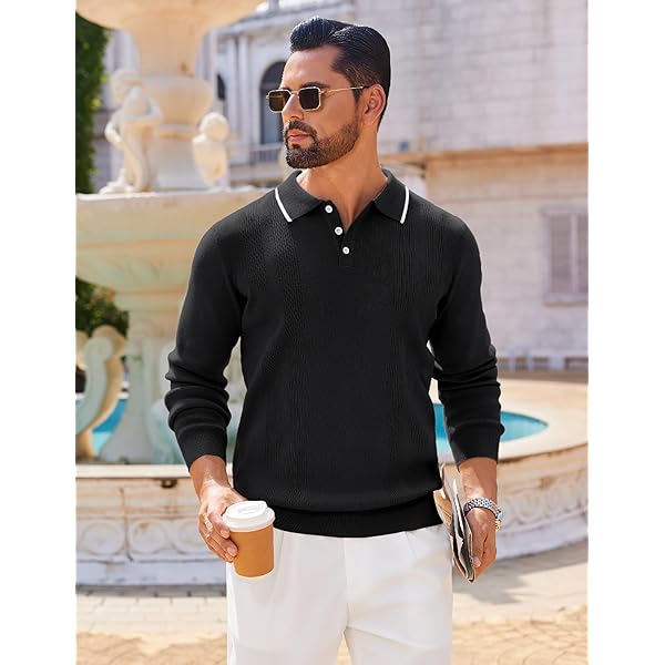 Black Knit Polo Shirt with Contrast Collar (Long-Sleeve)